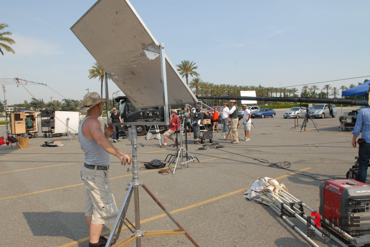 虽然这一天的气温达到了同期少有的超过40℃的高温,原以为过惯安逸生活的美国人会改变工作行程,没想到他们对于时间的概念竟如此看重,拍摄计划依然不变。由35人组成的摄制组,在租用的拍摄地点如期集结,同时提前预定的综合保障车、设备保障车、雪佛兰漂移车、移动拍摄车和洒水车,都相继到达了拍摄现场。