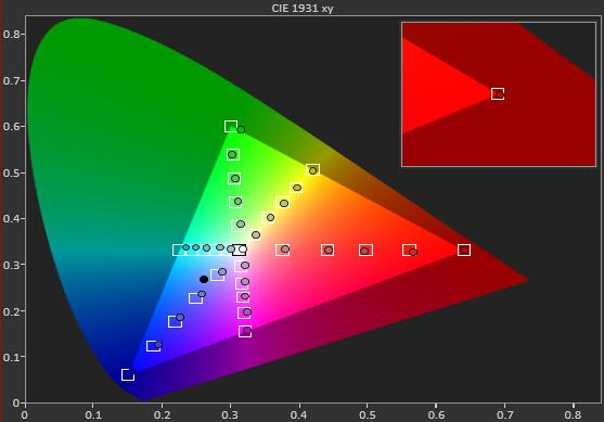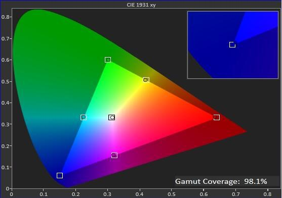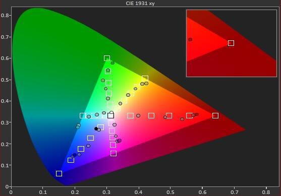 这是一幅完整的 REC-709 色域图(见图 1),沿三角形的边缘有六个白色方框,分别代表三原色(红、绿、蓝)和三补色(黄、品、青),这是色域范围的目标值。在每个方框内,有六个圆点,显示屏幕色域指标的测量值。当红、绿、蓝三种颜色的测量值完全打进方框内 (目标值),说明该显示屏幕的原始色域是符合 REC-709 色域范围的。
