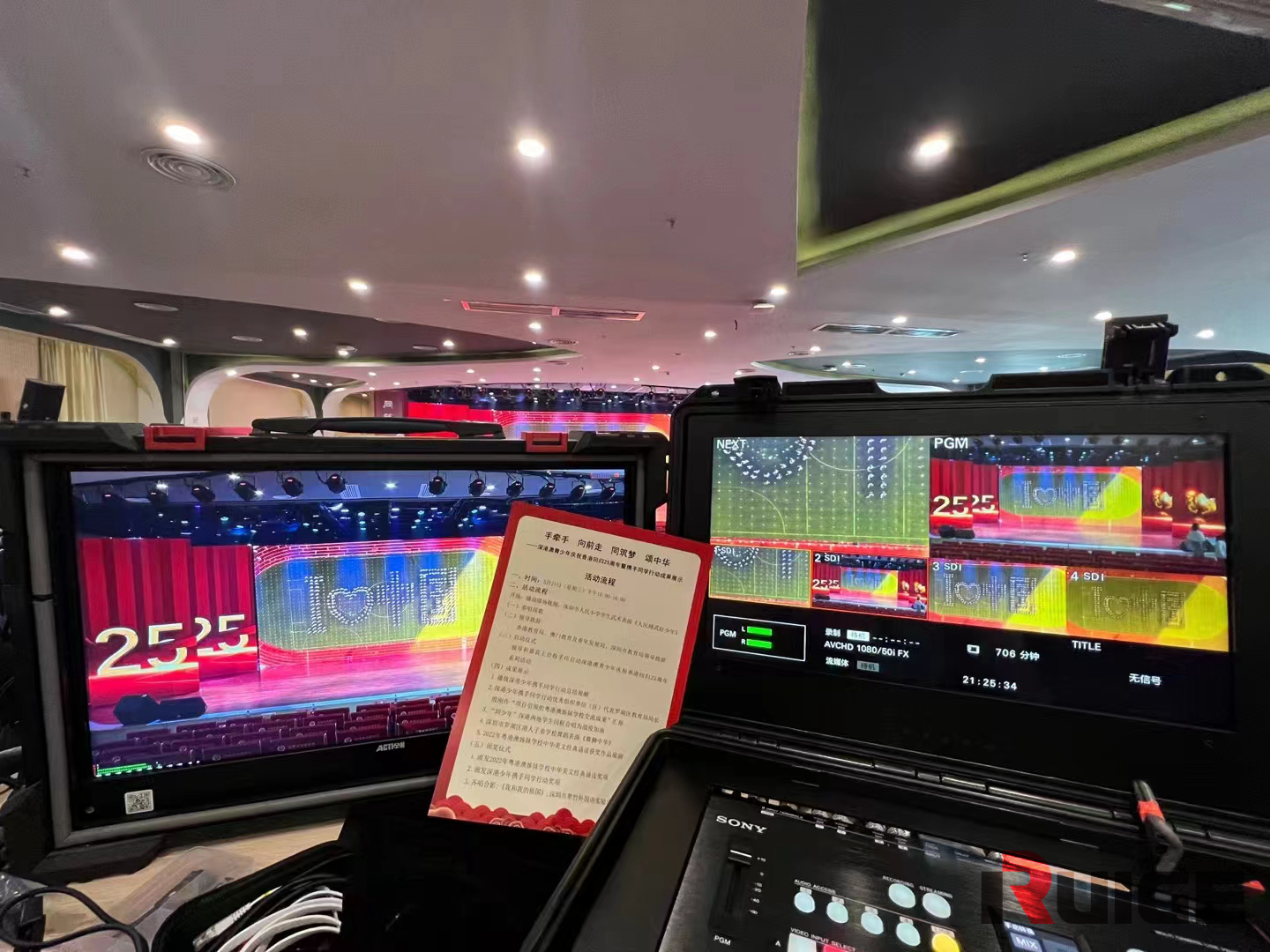 现场配备了一台21.5英寸的大尺寸铠甲一号监视器进行全程监看,使用SONY的导播台来切换多路高品质视频摄影机输入信号。另外两台音频切换台则负责现场多个音频讯道信号的控制和切换,保障了视频输出声画对位。真可谓分工明确,各司其职。