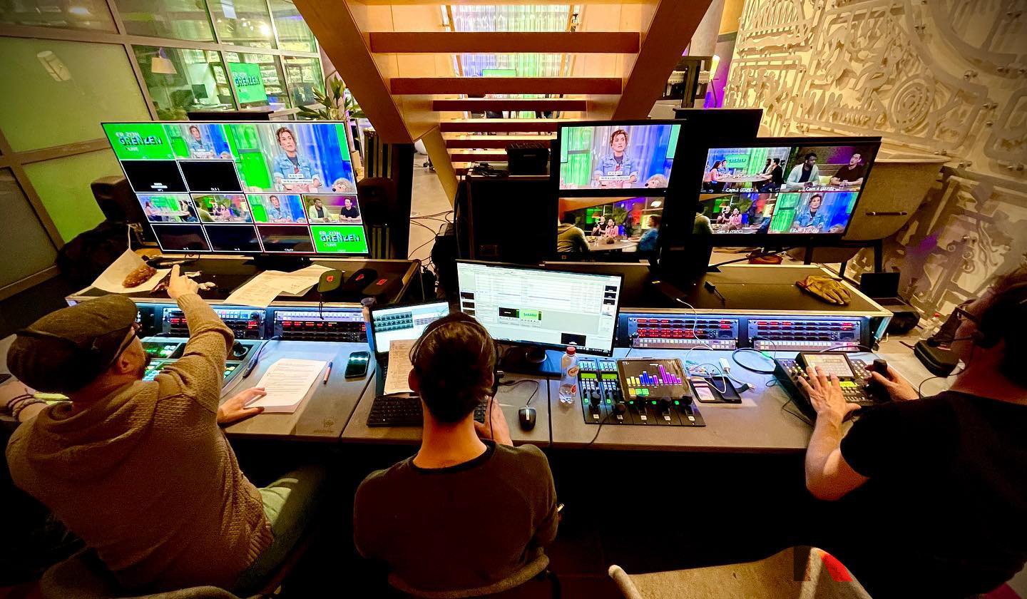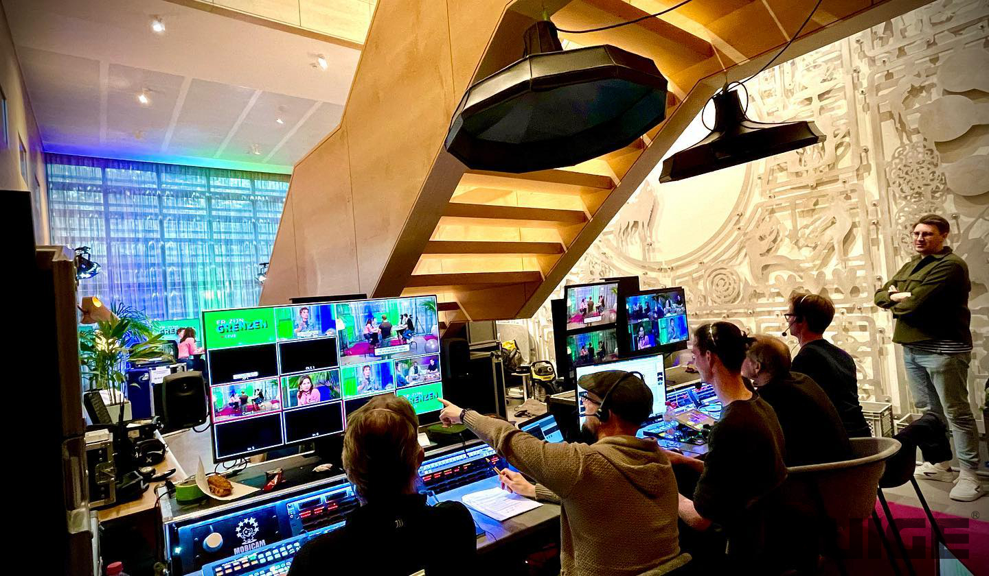 来到直播间的幕后,看到繁忙的景象,一切变得豁然开朗。只见众多的工作人员正在为节目直播忙碌着,有的一边盯着巨屏显示器一边通过无线麦克风给主持人提示;有的通过直播后台处理着网友的提问;有的通过监看瑞鸽的大屏桌面型监视器操控着导播台,控制网络直播摄像机,随时切换直播画面。分工明确,合作默契。