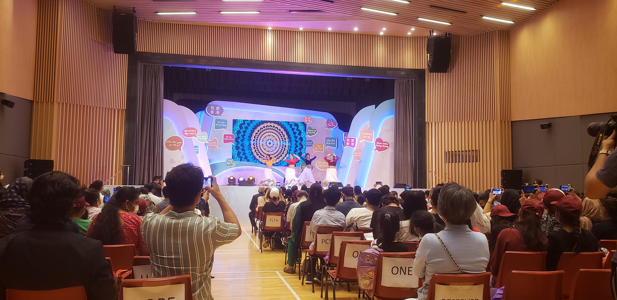 来到颁奖台前,映入眼帘的是幕布上使用了多种语言书写的“我爱香港”文字。台上现在正在颁发的是杰出融和奖,他们是从三百多名中小学生中遴选出的10位杰出代表。