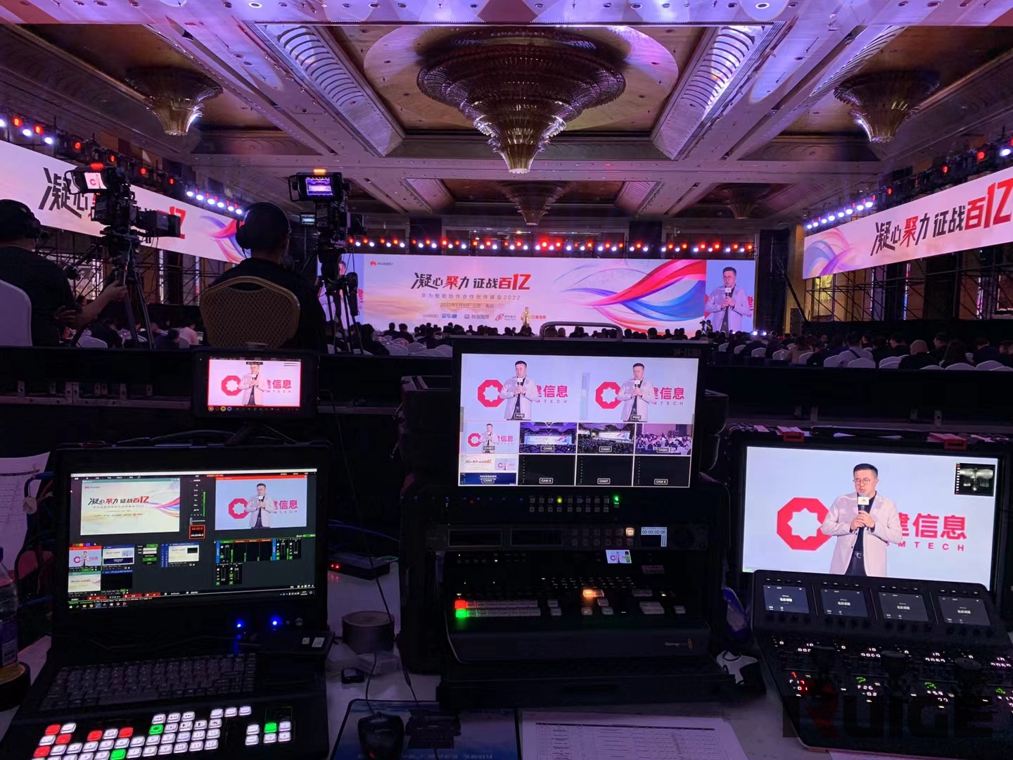 现场一共安排了4个专业摄像机机位,分别从不同角度来进行拍摄,还单独设置了一路虚拟演播室,专门进行峰会的直播信号传送。