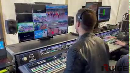 现场一共布置了6个专业摄像机拍摄机位和一路虚拟演播室。多名工作人员操控着专业的导播台设备控制直播画面的切换和播放。