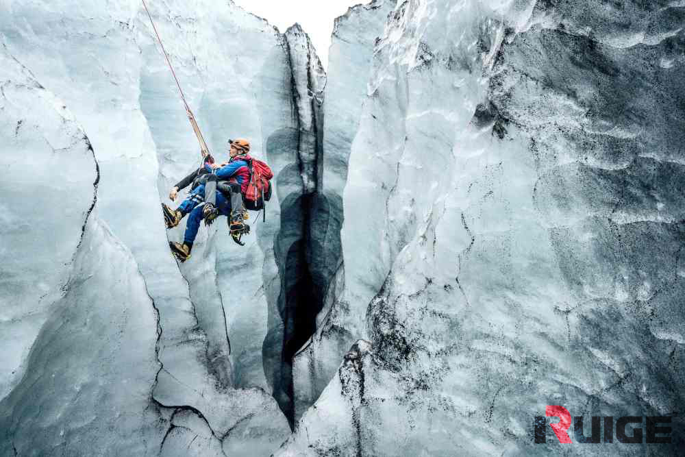 经过不断的搜索,终于在一处冰缝里发现了被困人员。救援人员立即放置救援绳,下到冰缝中展开营救。