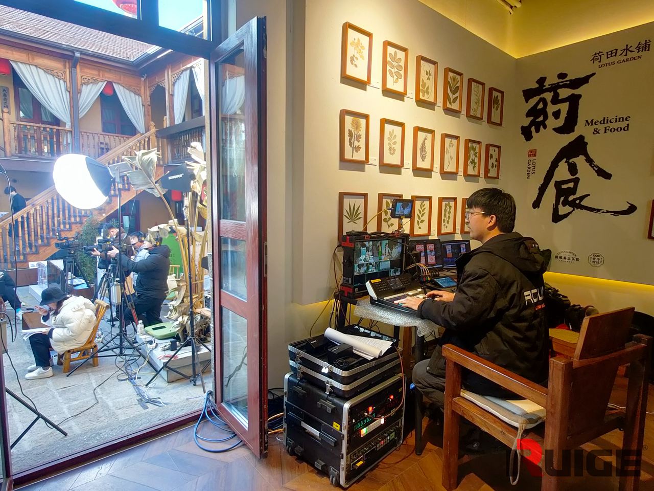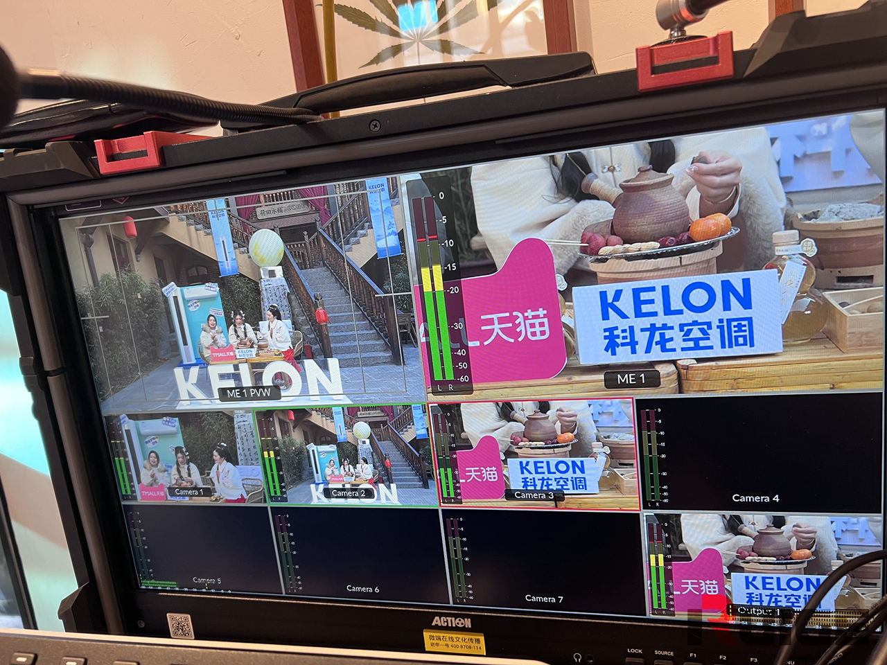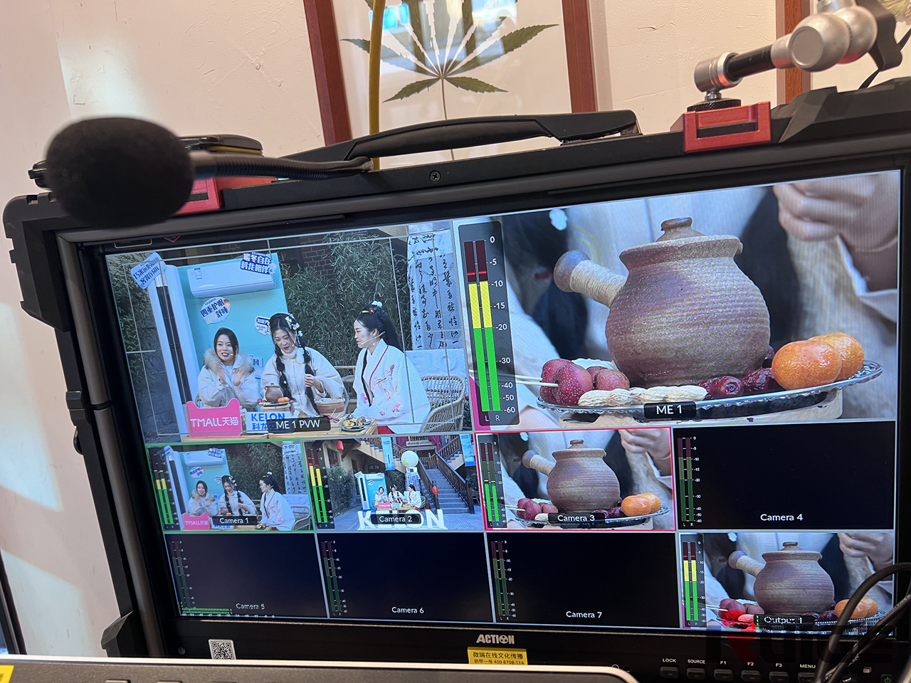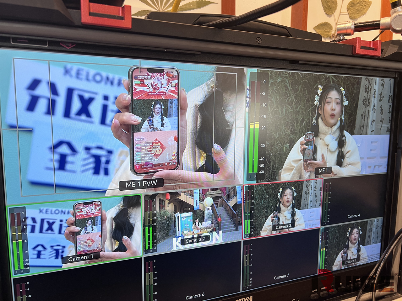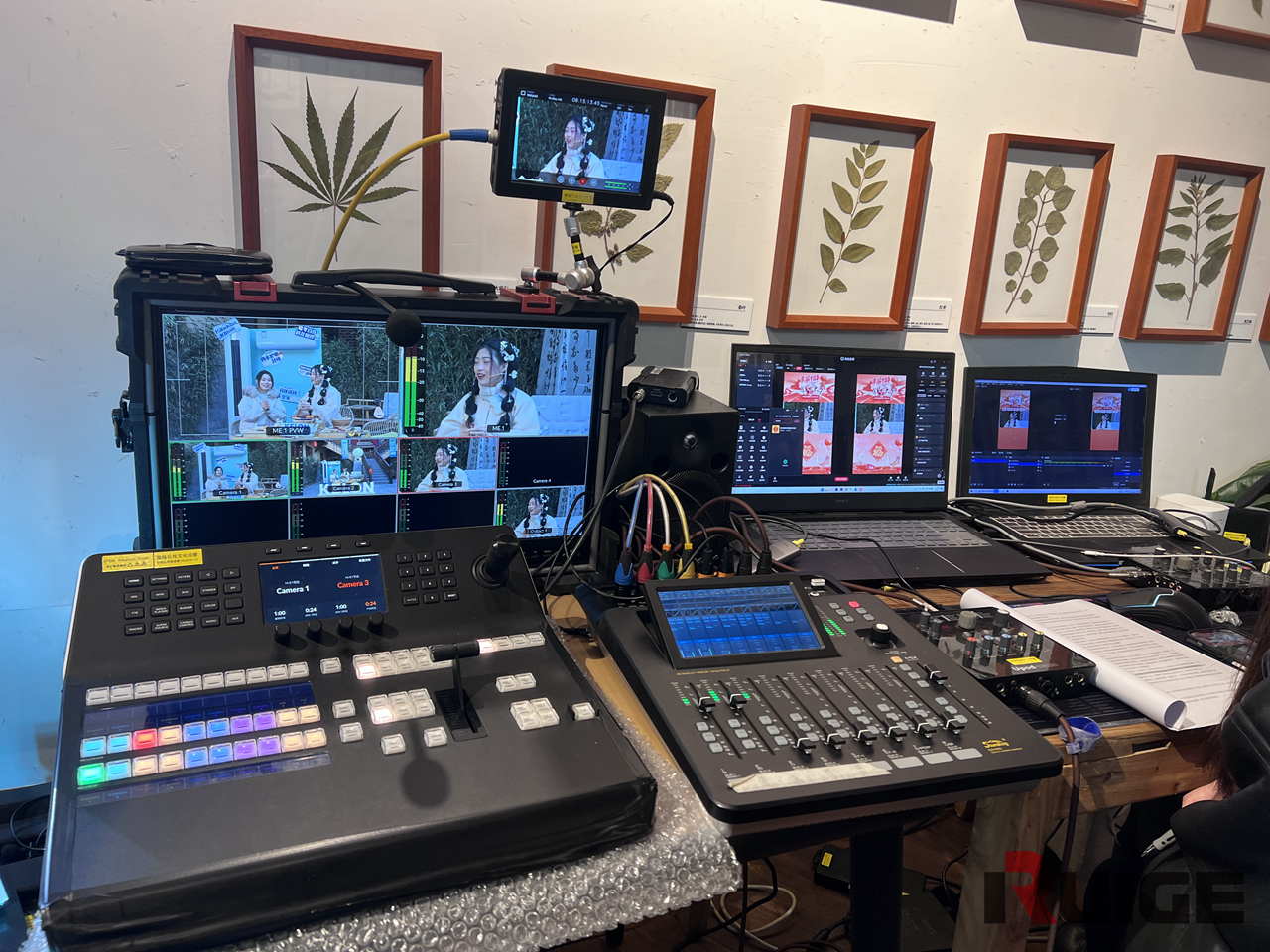 精彩的直播间背后,是专业的技术团队和设备在默默的支撑。现场不仅安排了三个拍摄机位,像导播台、大尺寸铠甲一号监视器、调音台等专业直播设备一应俱全。
