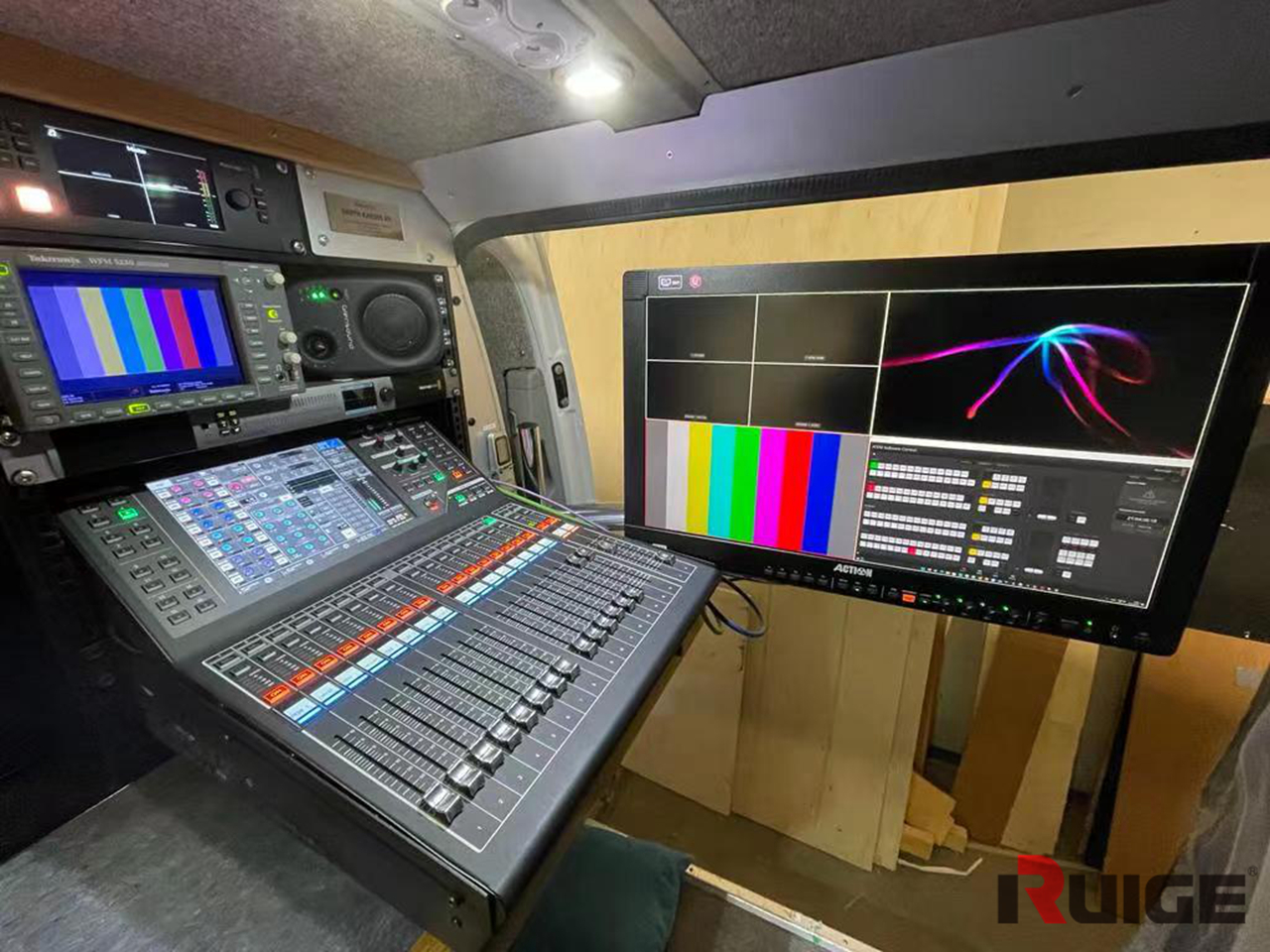 本次采用的瑞鸽4K HDR监视器,采用24英寸大屏显示监看。支持3840*2140分辨率、DCI-P3和BT.2020色域标准,提供4K超高清画质、HDR高动态范围和准确的色彩还原。还配备有12G-SDI、HDMI2.0接口,可与当下主流4K摄像机完美匹配。简直就是为4K转播车量身定制的。