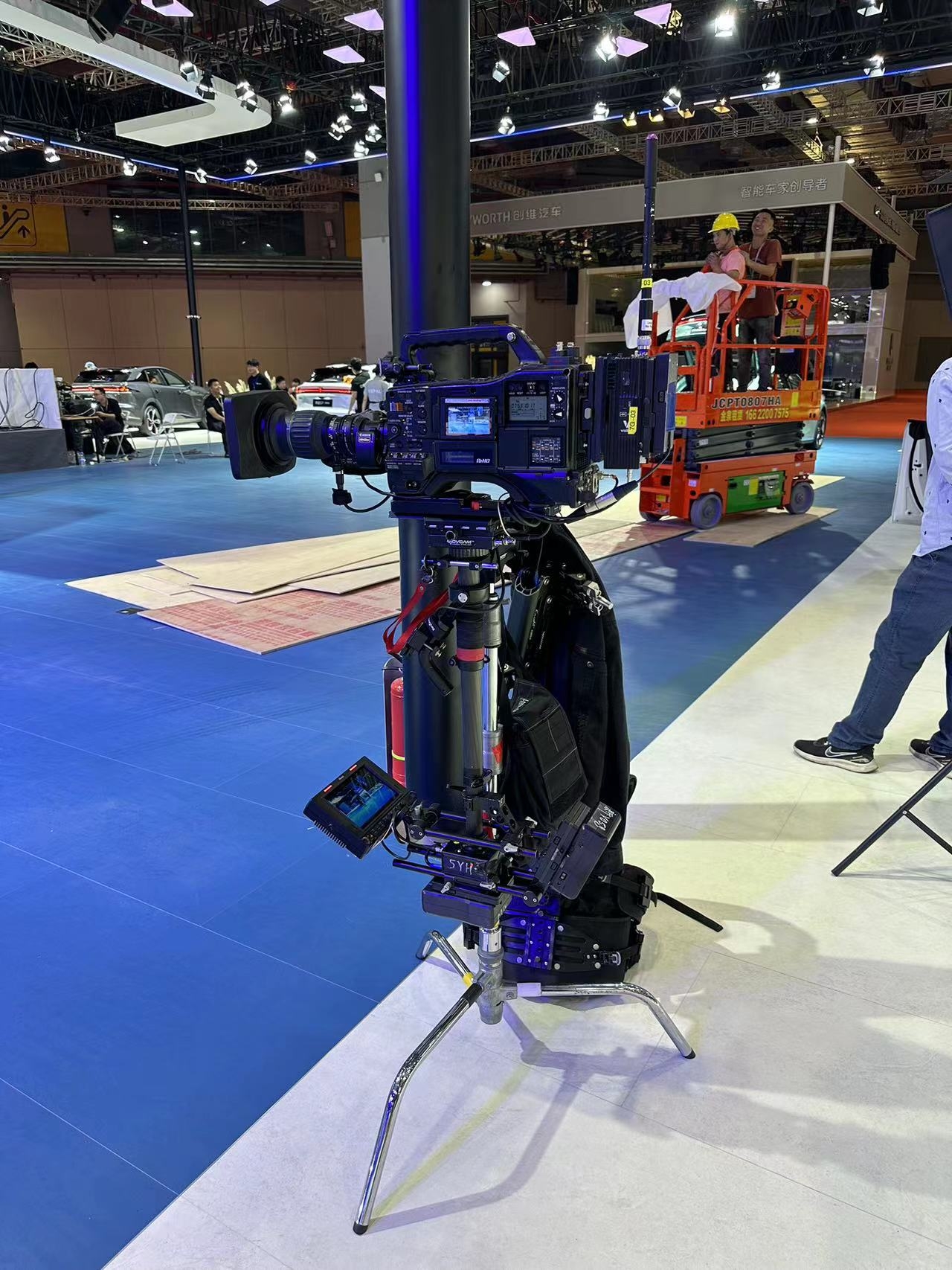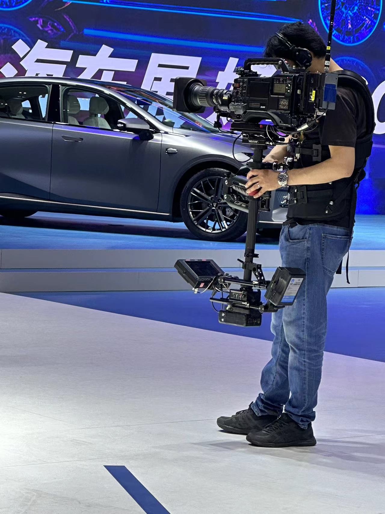 只见他身着承重背心,手持减震力臂,游走于车展会场进行拍摄。