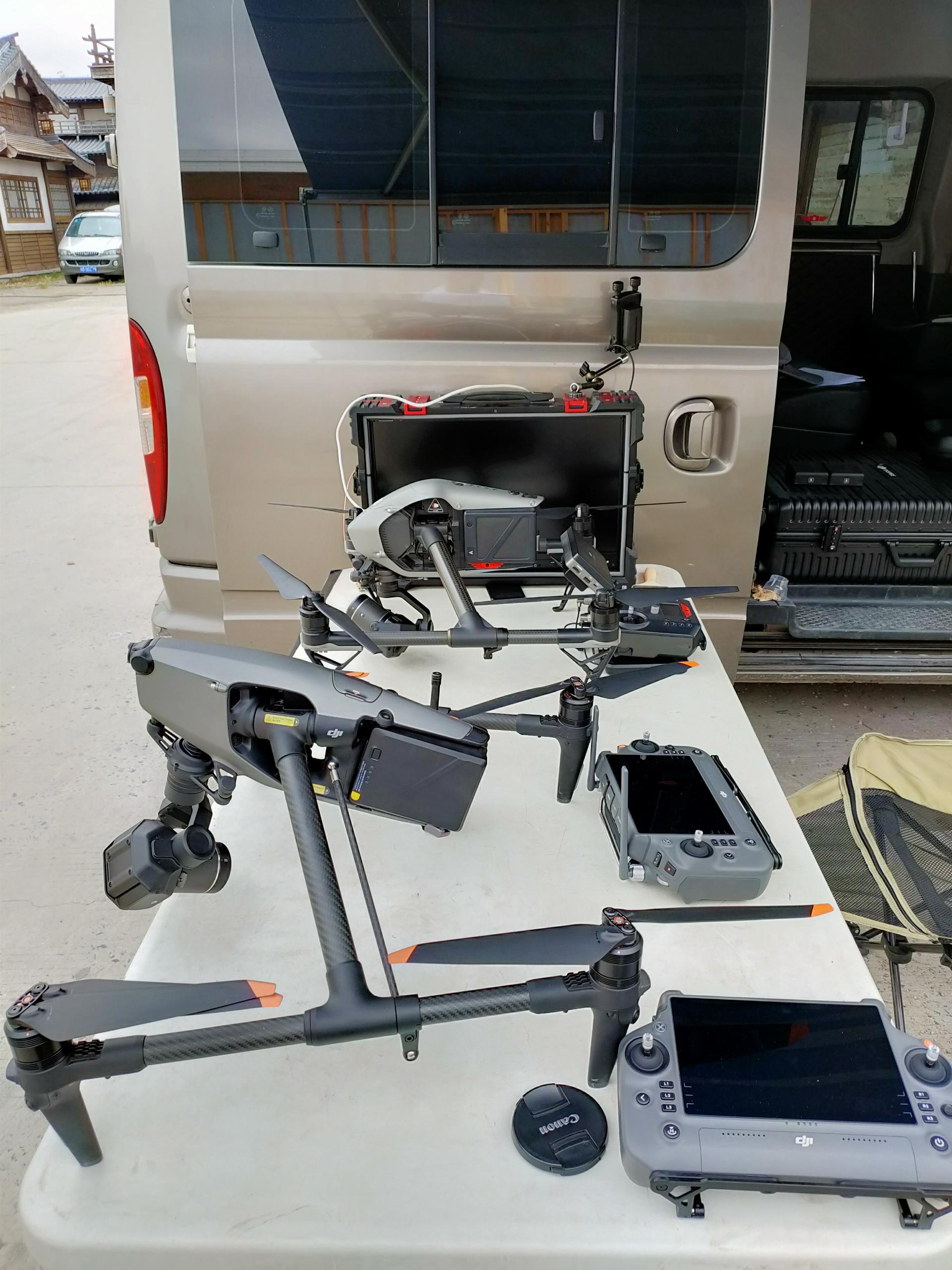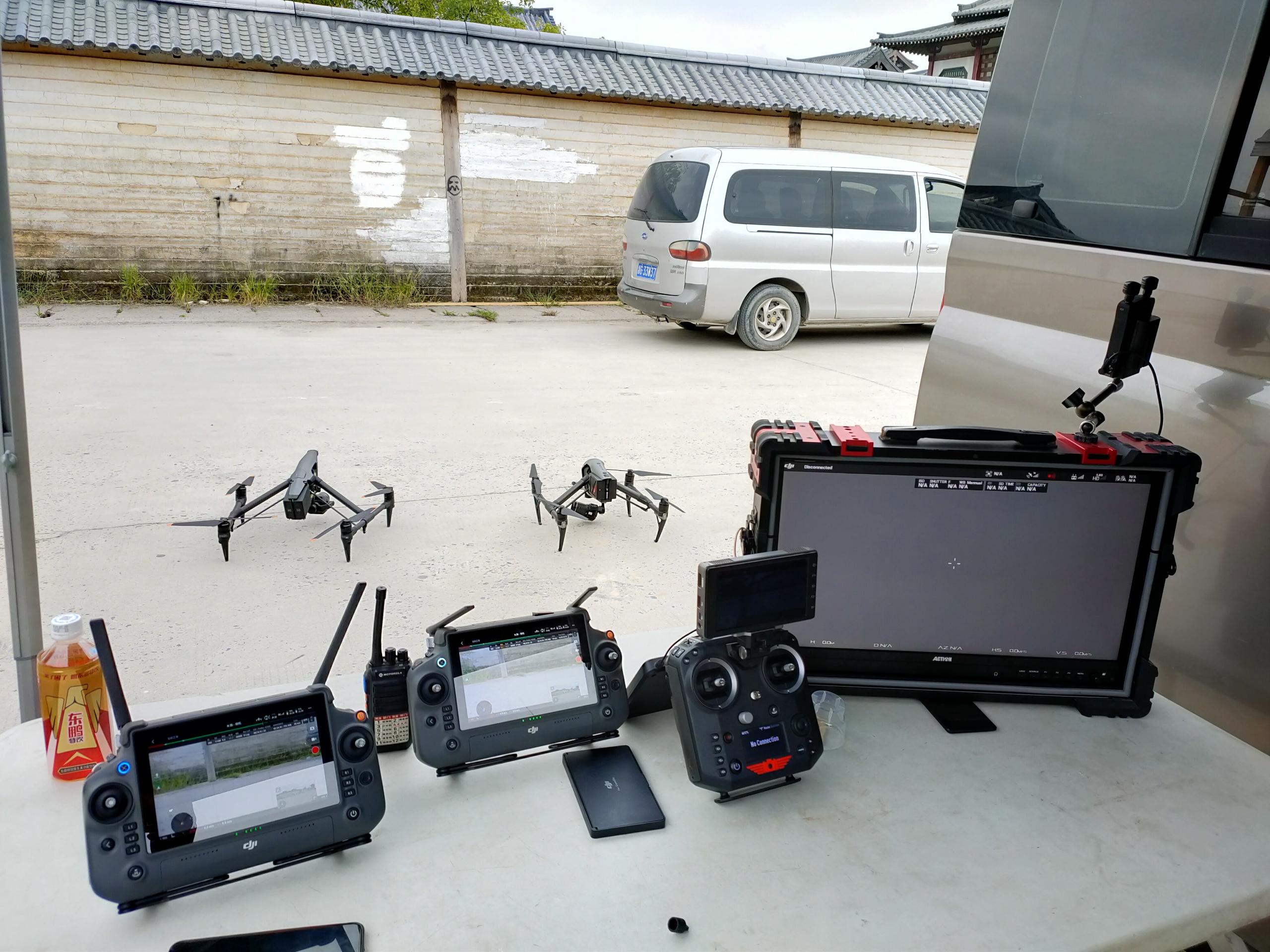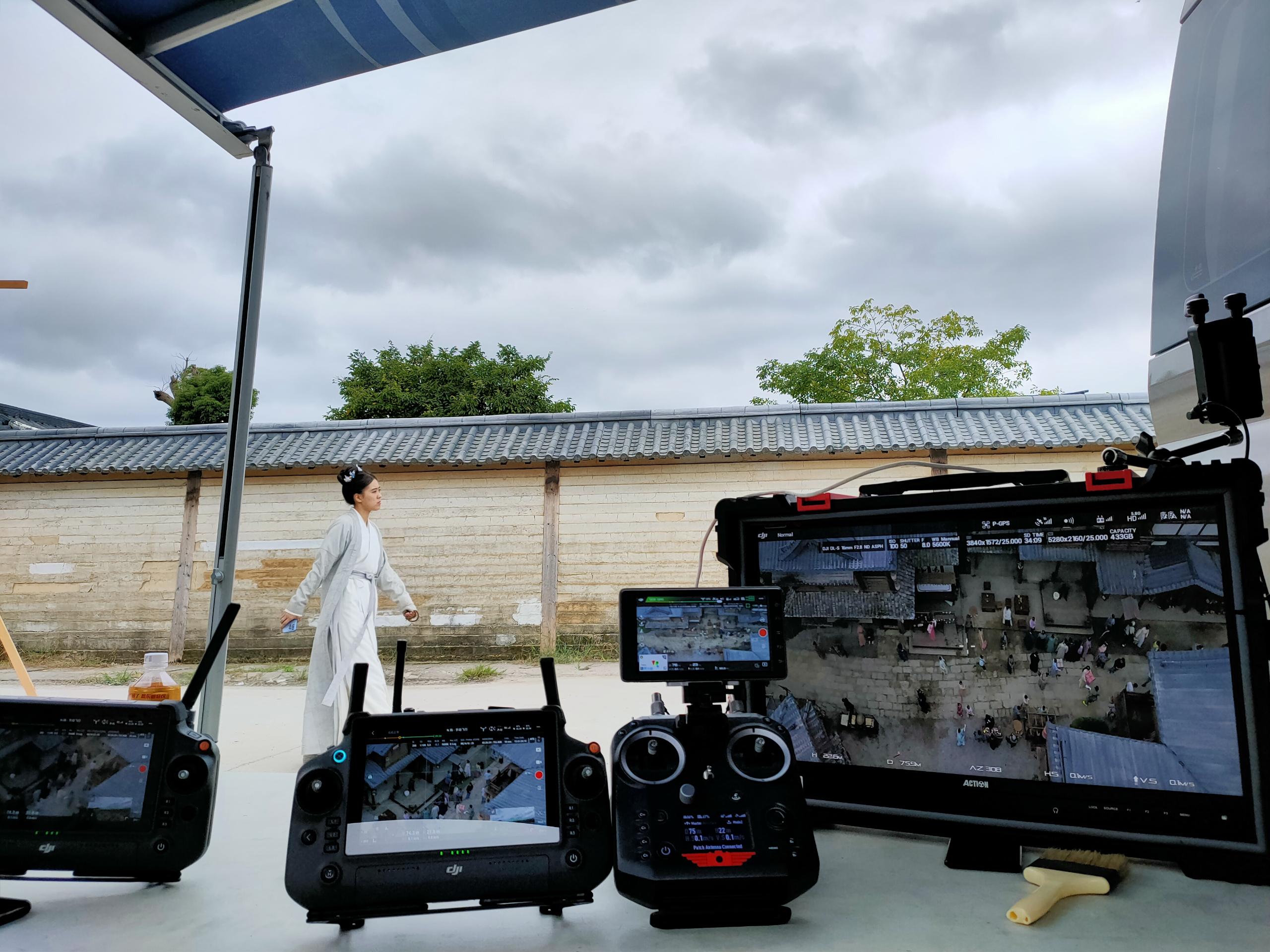 在古镇的一隅,我偶然发现了一个奇怪的场景。两架航拍无人机蓄势待飞,一旁的飞手正在等待起飞的指令。他的面前除了无人机遥控器外,还摆放了一部大尺寸的显示屏,它究竟是做什么用的呢?