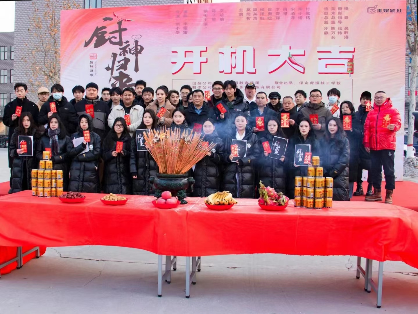在冬日的暖阳下,保定虎振技工学校的院子里聚满了人影。这是《厨神归来》开机仪式的现场,剧组成员手捧着象征好运的红包,背后是悬挂着“厨神归来,开机大吉”巨幅横幅。那一天,每个人的脸上都洋溢着希望与期待。