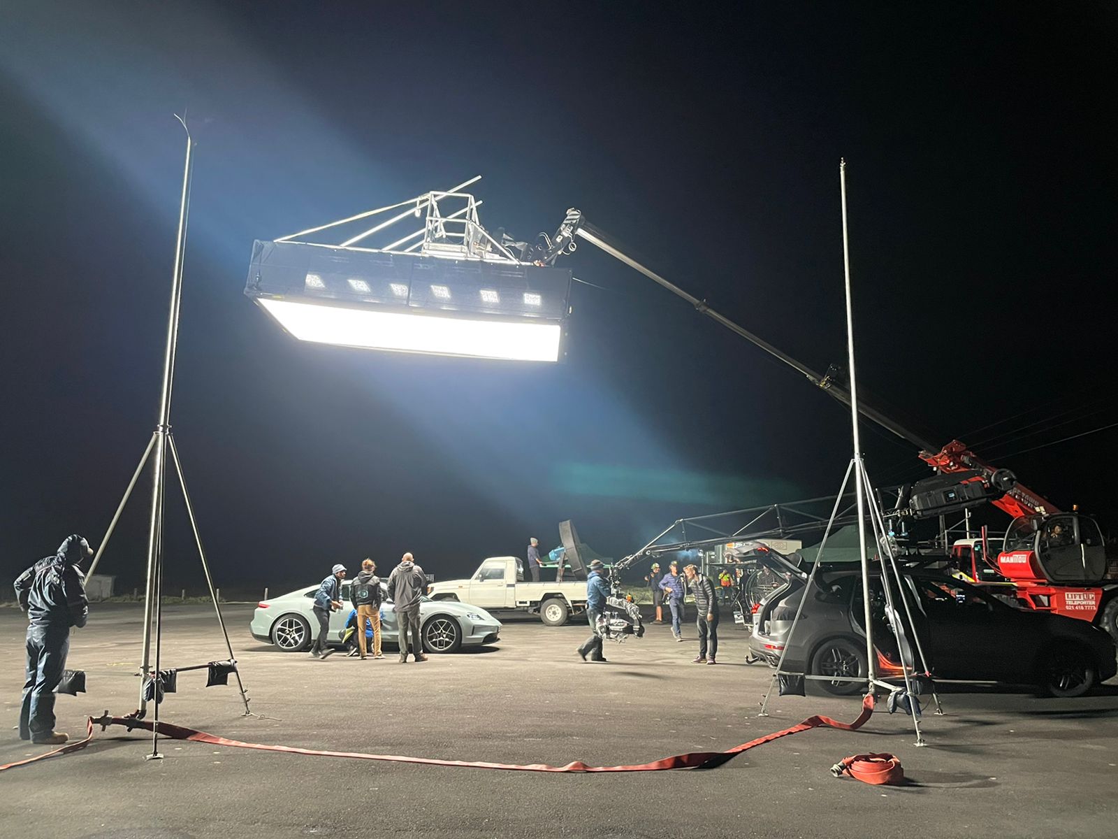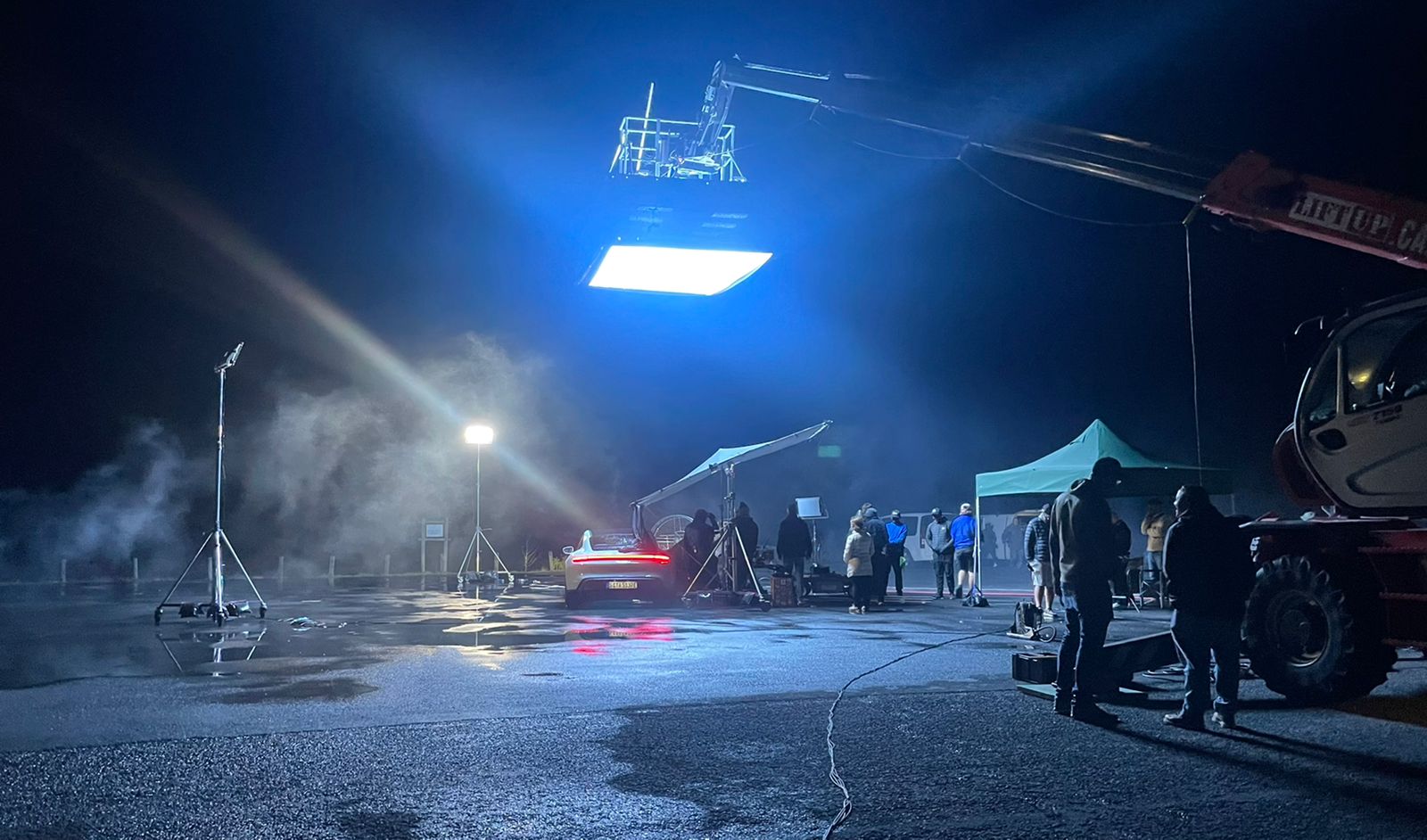 当夜幕降临,拍摄现场却亮如白昼。大型灯光装置和多角度摄像机布置,让整个场景在夜色中格外亮眼。这些精心设计的灯光和摄影设备,将用来拍摄Taycan的流线型车身,以及捕捉它在夜色中如幽灵般穿梭的魅影。