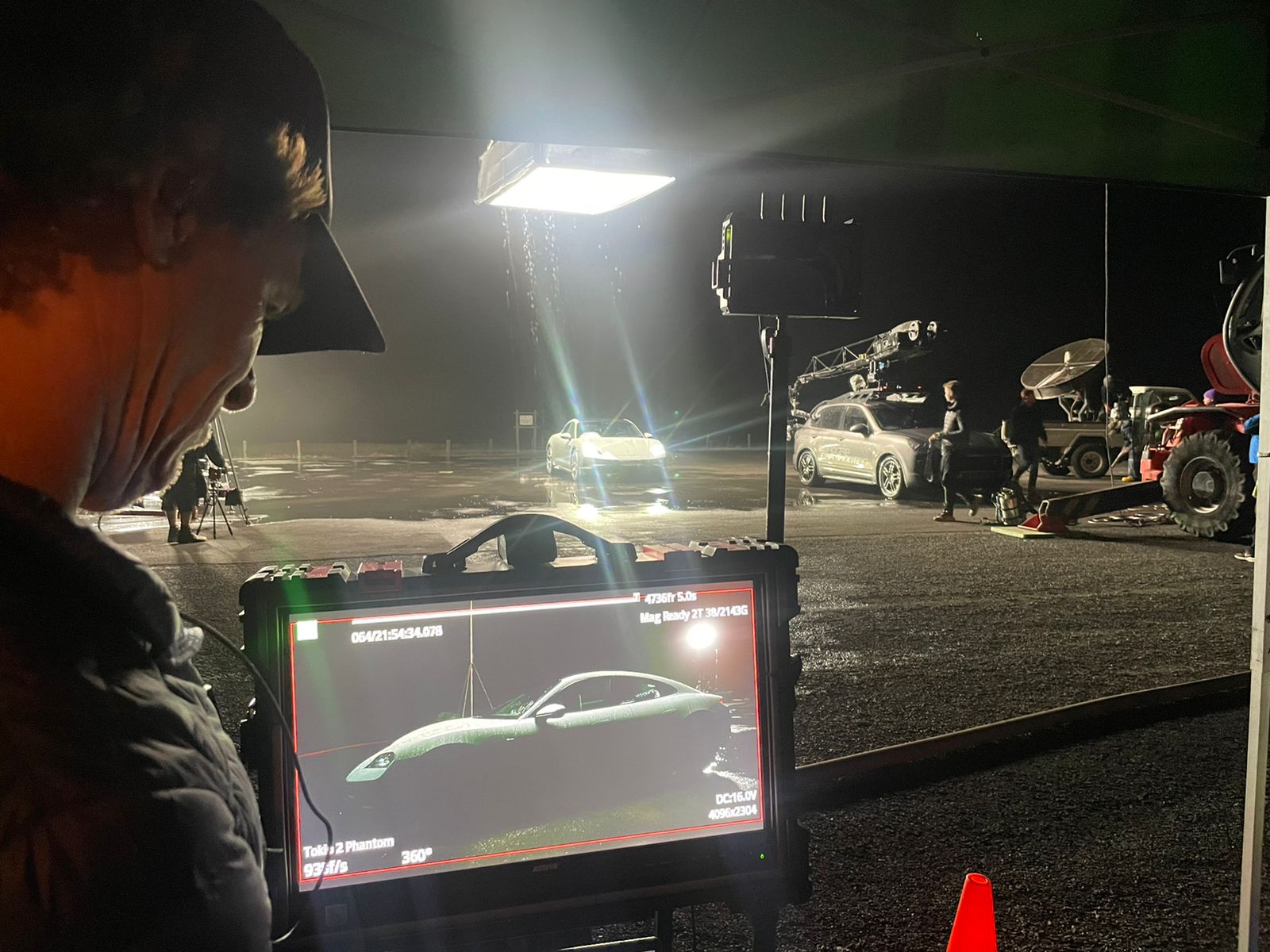 导演此刻正紧盯着监视器的画面,屏幕中正在播放高速摄像机拍摄下的慢动作镜头,用来展示Taycan的卓越性能。导演专注的神情,体现了他对每一个细节的严格把控。