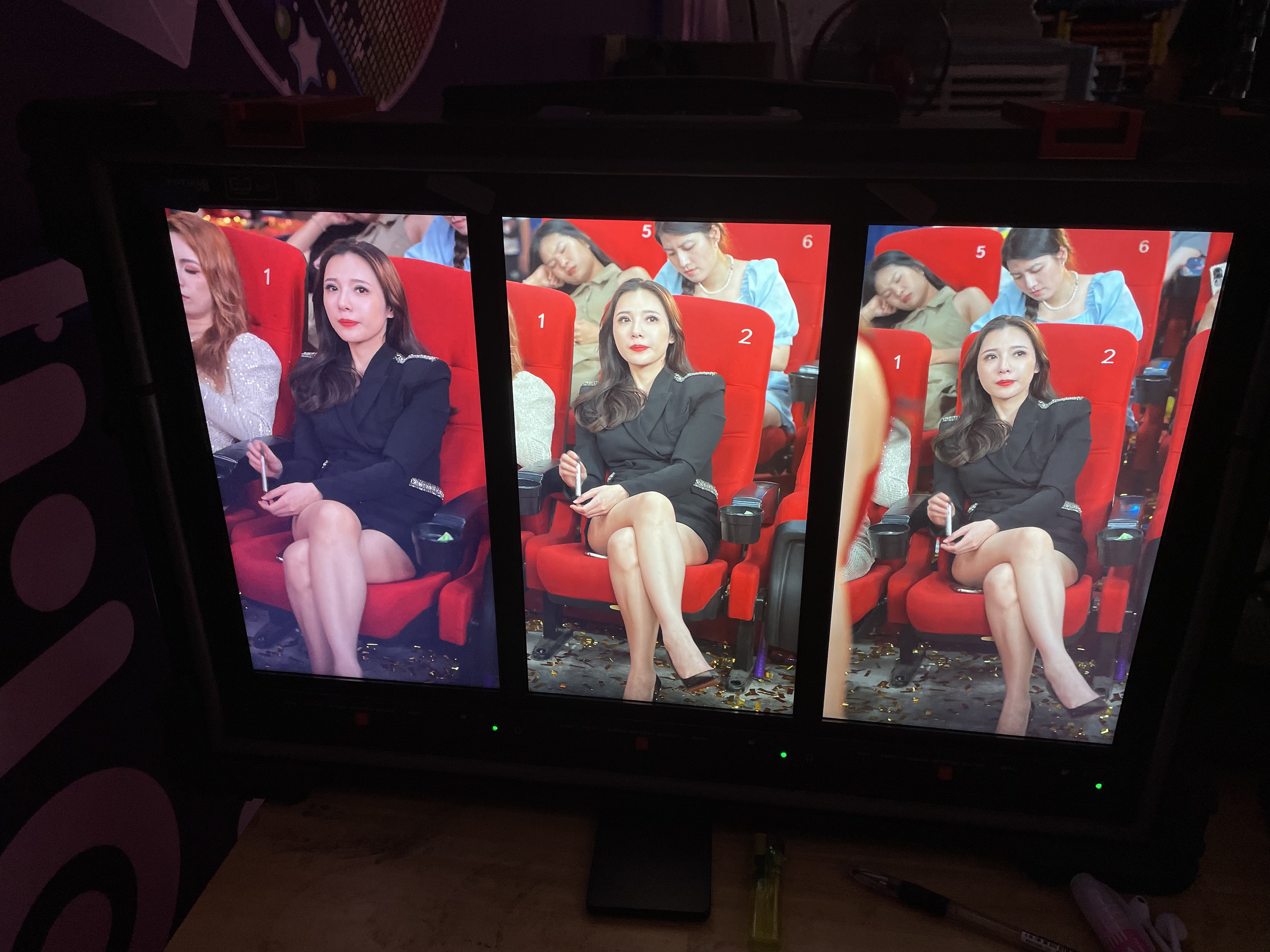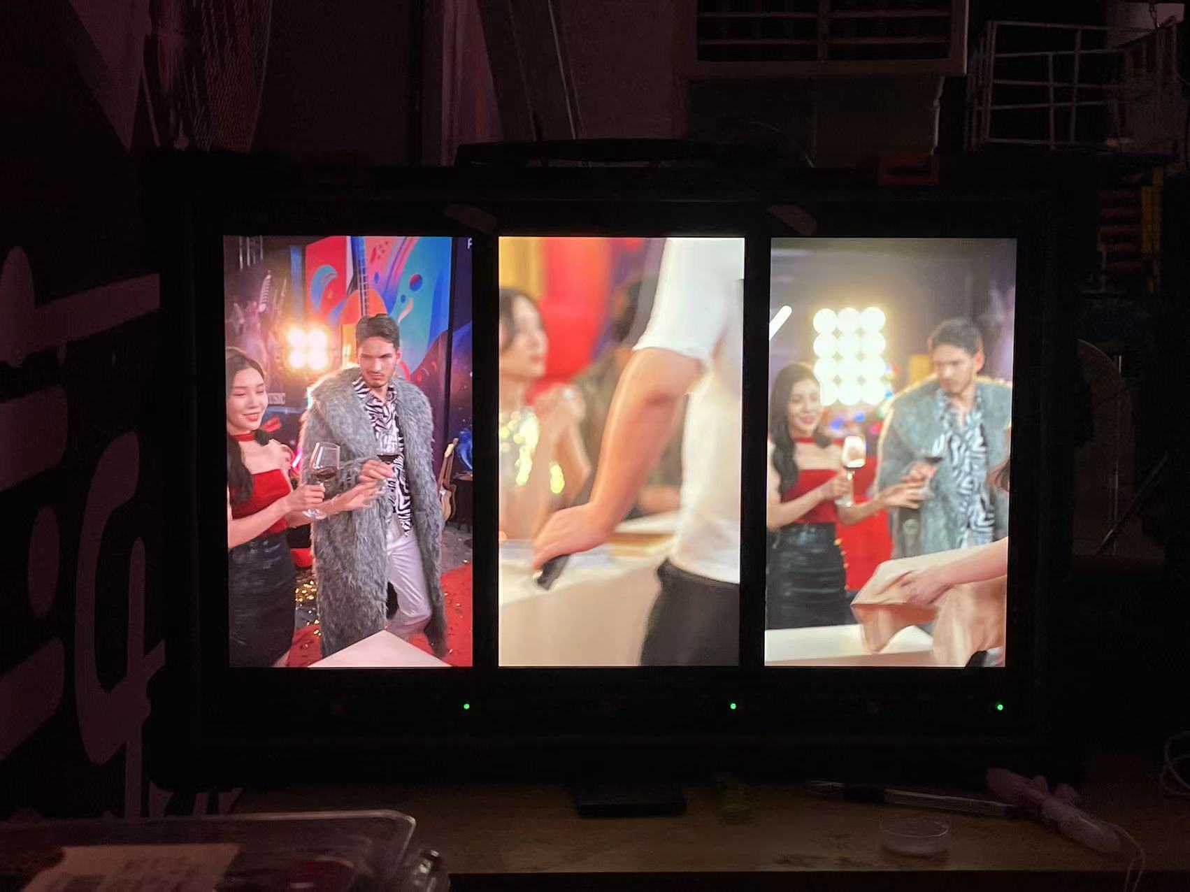 在一个派对场景的拍摄中,三联竖屏监视器同时显示了不同机位的实时画面。导演通过监视器,能即时查看每个机位的画面效果,快速做出调整指示。这种即时反馈的能力,显著提升了拍摄质量和效率,避免了后期因画面问题而进行的繁琐补拍。