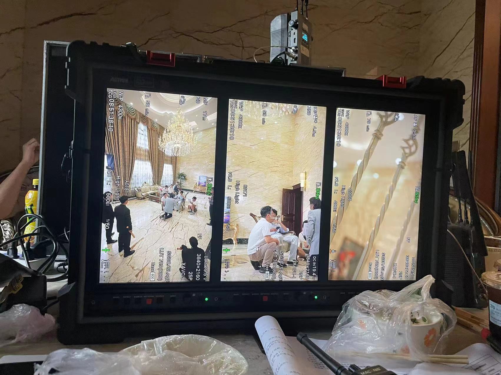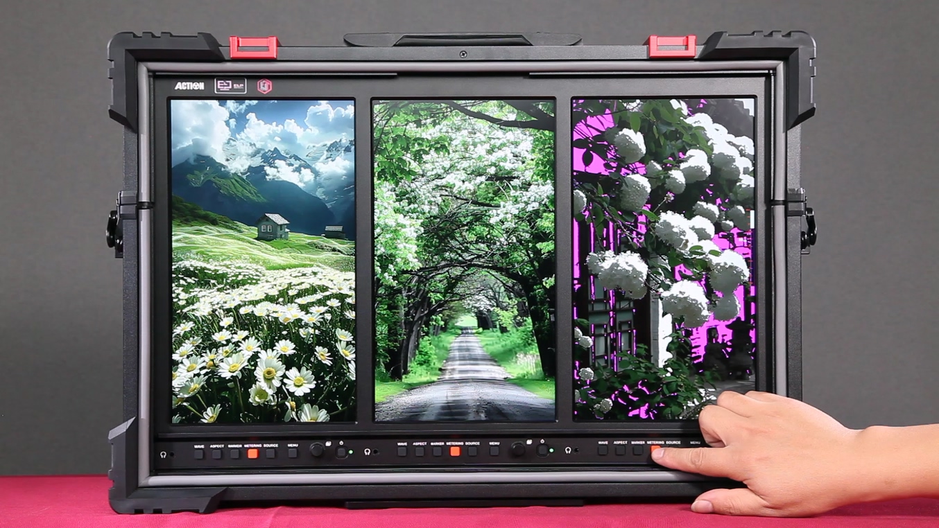 为了解决这一痛点,在某短剧拍摄现场,一款三联竖屏短剧监视器配备的一键测光功能完美解决了这一难题,使得布光师能够快速测量画面中的曝光情况,并通过颜色标识出曝光过度和曝光不足的区域,帮助其快速调整光线。
