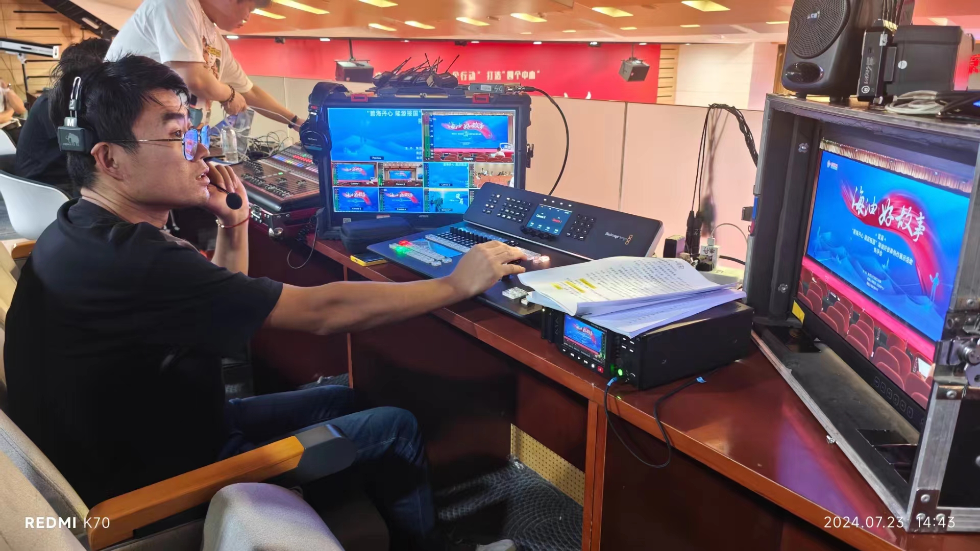 活动当天一大早,我们团队成员就来到技术控制室开始忙碌起来。我戴上耳机,调整话筒,目光紧盯着多台监视器。这些监视器分别展示着多路摄像机的实时拍摄画面。桌面上摆满了视频切换器、调音台等设备,这些都是我指挥这场直播的“武器”。