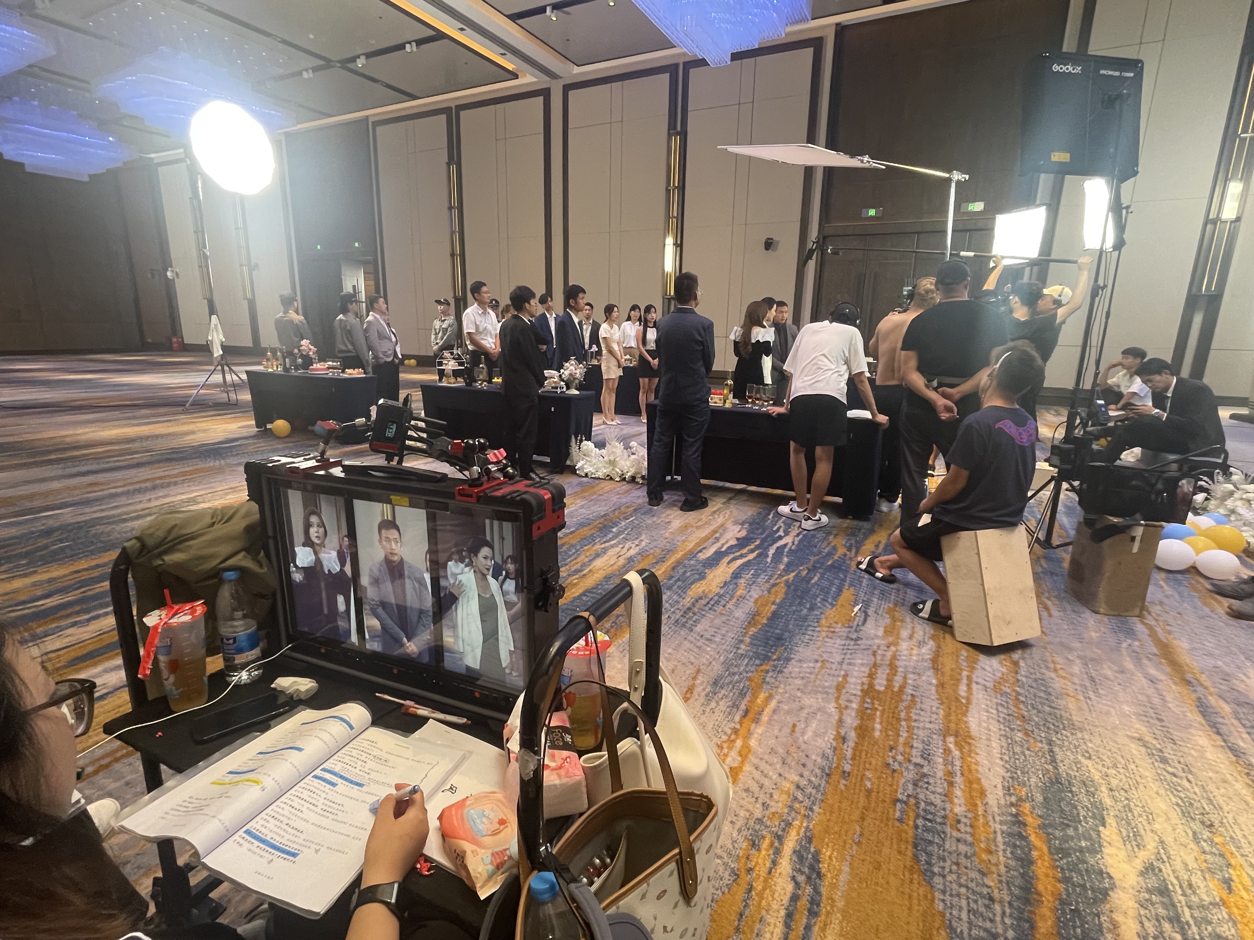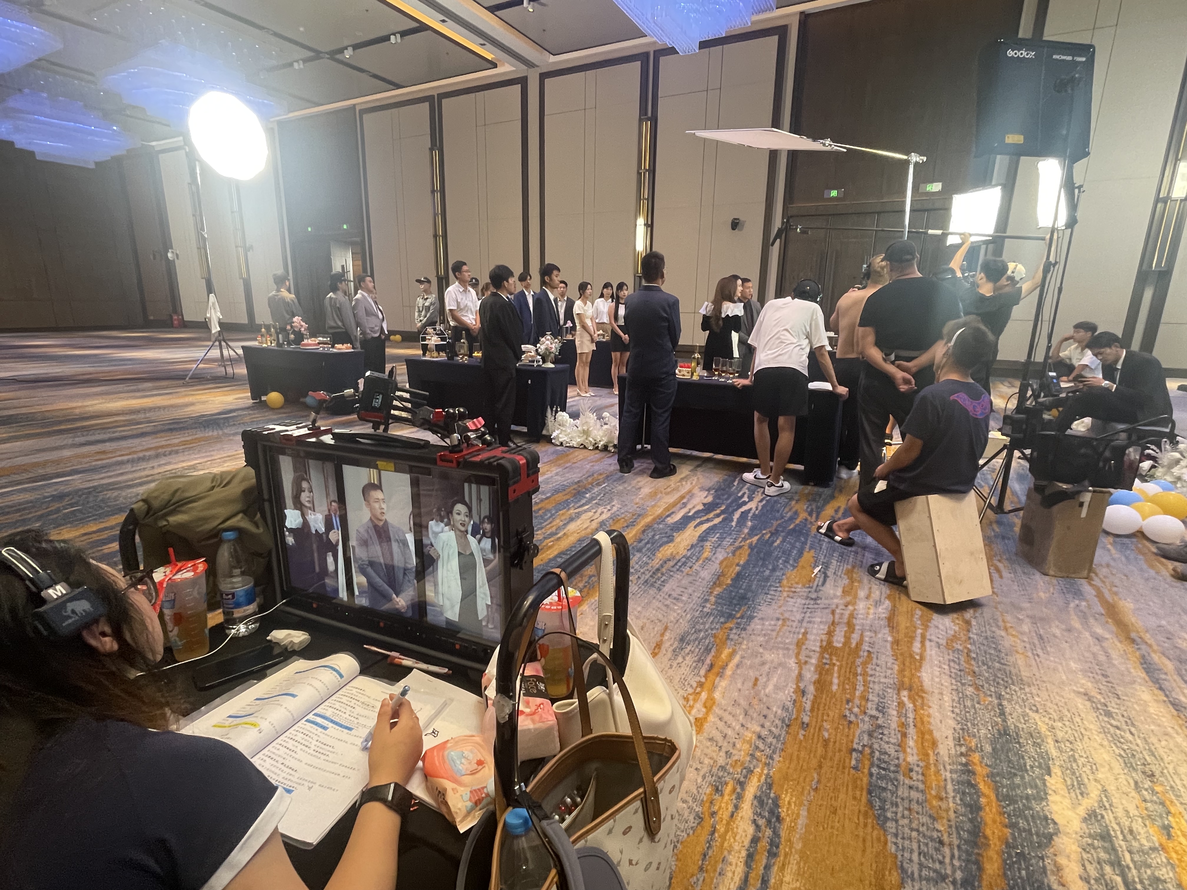 在一个宽敞的大厅内,剧组人员正在忙碌地布置着场地。作为一部竖屏短剧的拍摄现场,紧凑的拍摄计划和节奏让每个人都紧张又兴奋。导演站坐在一旁,正注视着演员们就位的场景,而一旁的工作人员正快速调整灯光与摄像机的角度。