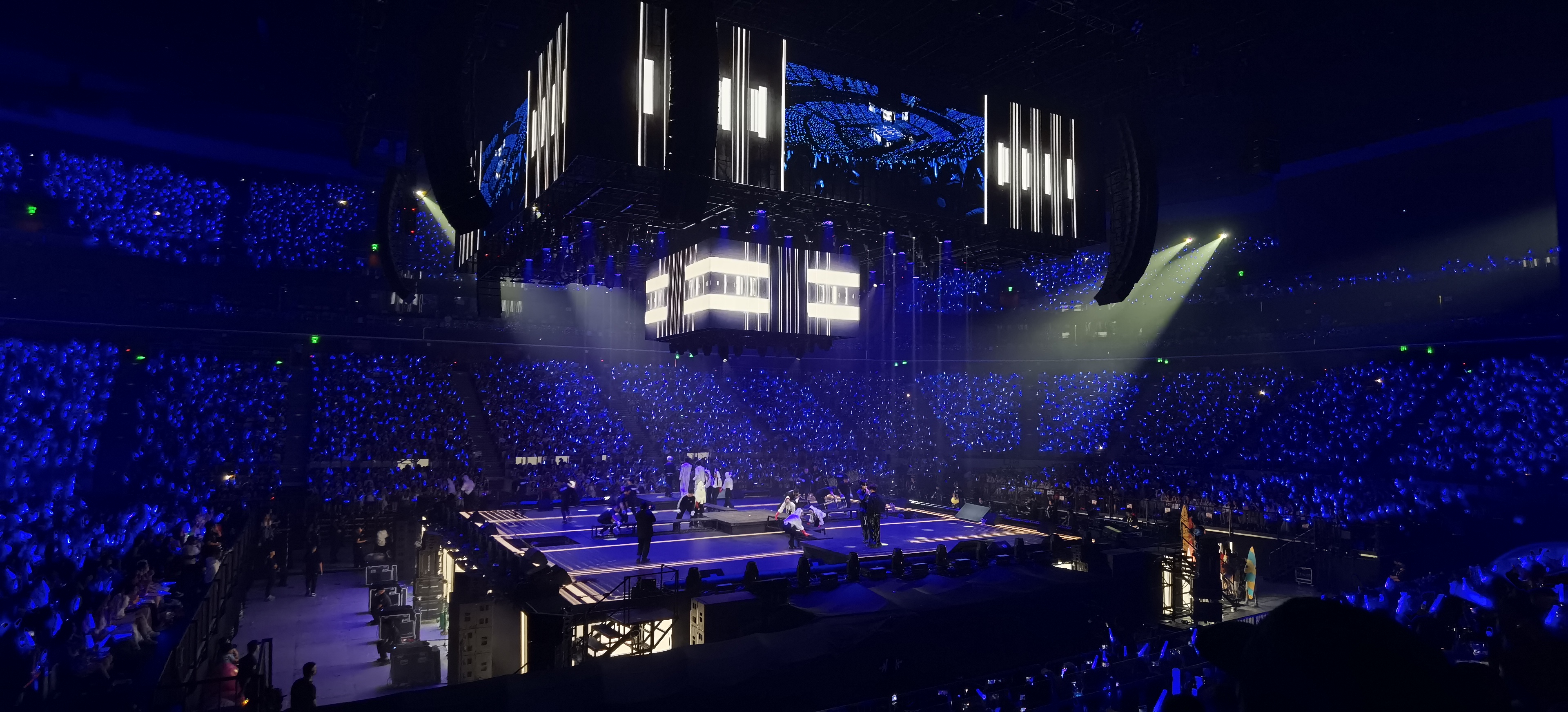 随着节奏推进,演唱会的灯光效果不断变化,色彩和图案相互交织。我的屏幕上显示出不同镜头下的丰富画面,导演紧盯着屏幕,为精准表现这一奇幻视觉体验而调度着音效与灯光。